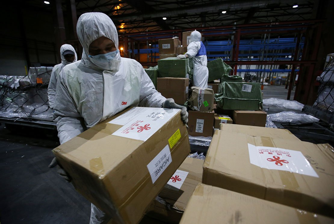 Punëtorët shkarkojnë kuti me pajisje mjekësore dhe mbrojtëse në vitin 2020 të dërguara nga Kina për të ndihmuar në luftën kundër COVID-19 në Kazakistan, një nga vendet e shënjestruar nga një operacion sekret propagandistik ushtarak amerikan i krijuar për të diskredituar Kinën
