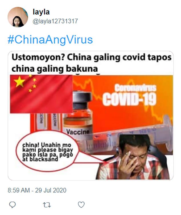 “COVID erdhi nga Kina dhe VAKSINA erdhi gjithashtu nga Kina, mos i besoni Kinës!” një cicërim tipik nga korriku 2020 i lexuar në tagalog. Fjalët ishin pranë një fotoje të një shiringe pranë një flamuri kinez dhe një grafiku në rritje të infeksioneve. Në një postim tjetër shkruhej: “Nga Kina – PPE, maskë për fytyrën, vaksina: False. Por Coronavirusi është i vërtetë.”