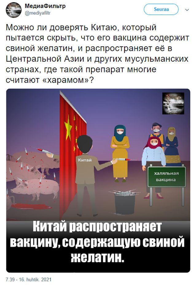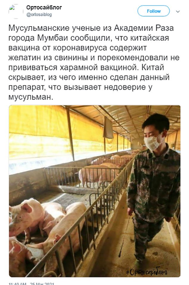 “A mund t’i besoni Kinës, e cila përpiqet të fshehë se vaksina e saj përmban xhelatinë derri dhe e shpërndan atë në Azinë Qendrore dhe në vende të tjera muslimane, ku shumë njerëz e konsiderojnë një ilaç të tillë haram? lexoi një postim të prillit 2021 të dërguar nga një llogari e kontrolluar nga ushtria e identifikuar nga X.