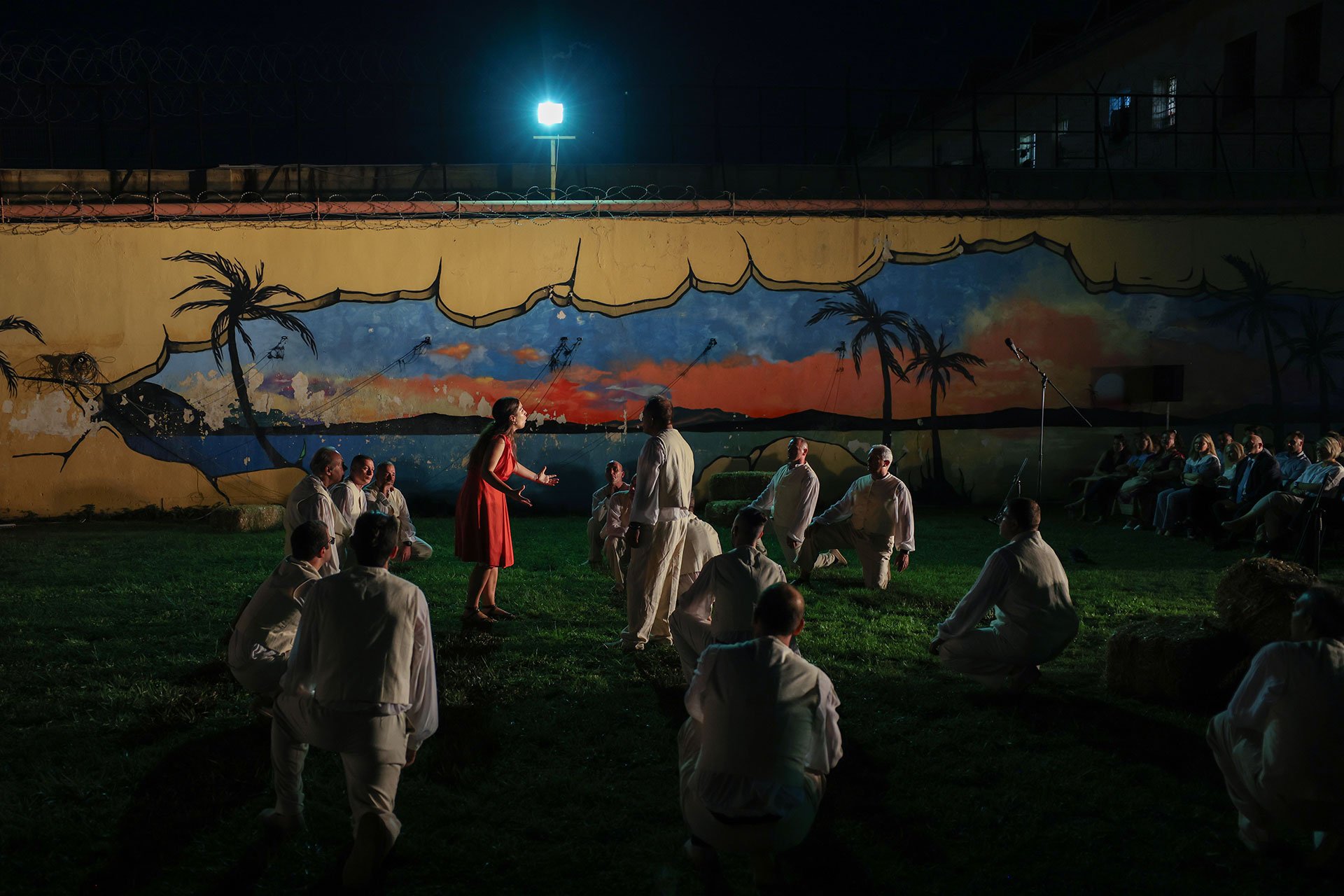 Në një mbrëmje mbytëse vere, aktorët dolën në skenë: një oborr me bar i rrethuar nga mure të larta burgu, i mbuluar me tela me gjemba dhe i ndriçuar nga një prozhektor i fortë.