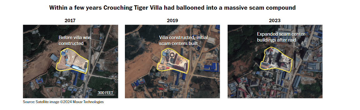 Pas kateve të mëdha të kazinove, filloi të rritet një industri më e keqe. Dokumentet e gjykatës kineze tregojnë se të paktën nga viti 2018 “sindikatat kriminale” po kontrabandonin njerëz në vilën ‘Crouching Tiger’, një sallë banketi dhe hotel, dhe i detyronin të punonin si mashtrues. Kompleksi është në pronësi të familjes Ming, pasardhës të klanit Bai, sipas mediave shtetërore kineze dhe një personi që punonte në vilë.