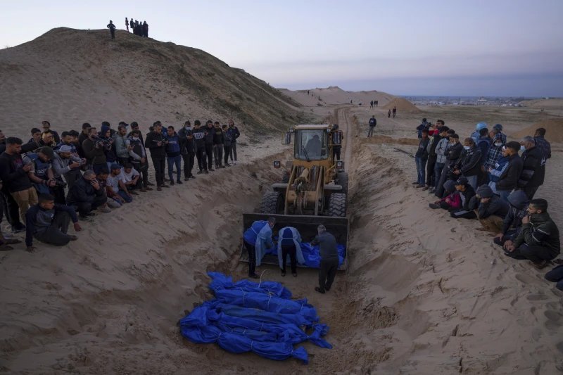 Një buldozer shkarkon trupat e palestinezëve të vrarë në sulmet izraelite dhe të dorëzuar nga ushtria izraelite gjatë një funerali masiv në Rafah, Rripi i Gazës, të martën, 26 dhjetor 2023