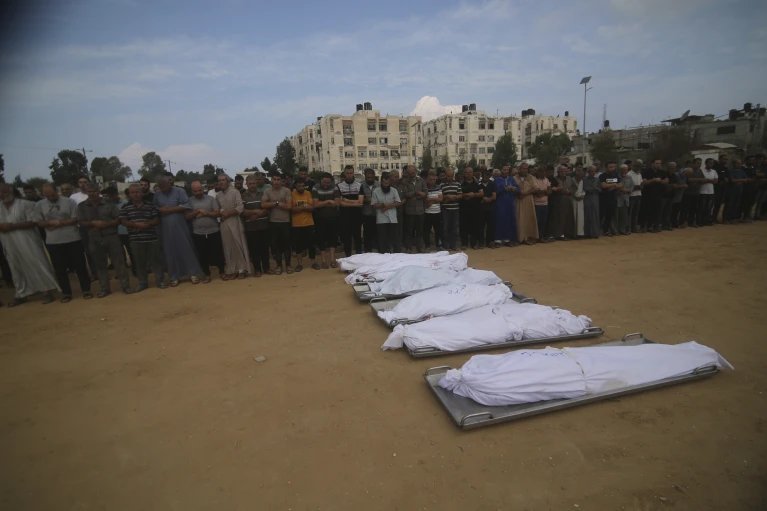 DOSJE – Vajtuesit luten pranë trupave të anëtarëve të familjes al-Agha që u vranë gjatë një sulmi ajror izraelit, gjatë funeralit të tyre në Khan Younis, Rripi i Gazës, të mërkurën, 11 tetor 2023