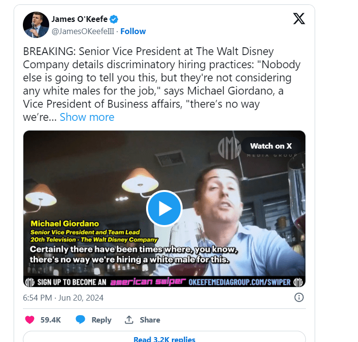 Kompania Walt Disney me bazë në Kaliforni diskriminon qëllimisht “meshkujt e bardhë”, sipas një videoje që është publikuar nga gazetari amerikan James O’Keefe.