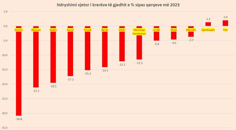 Të dhënat e INSTAT-it tregojnë se rënia e madhe gjeti në vitin 2023 në krahasim me 2022 në Qarkun e Durrësit me -30.8%, Elbasanit me -21%, Kukësit me 19% dhe Korçës me 17.2%. Në këtë qarqe, tkurrja ishte më e madhe se mesatarja kombëtare 11.5%.