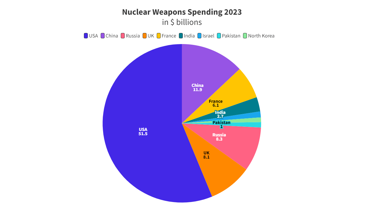Bota shpenzoi 91,393,404,739 dollarë për armët bërthamore në vitin 2023. Shuma është rreth 250 milionë dollarë çdo ditë, 173,884 dollarë në minutë, ose 2,898 dollarë në sekondë.