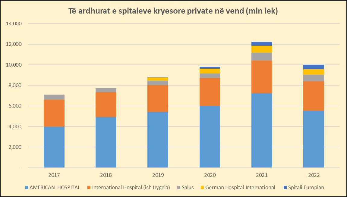 Të dhënat e tjera të Monitor, të përpunuara nga bilancet zyrtare bëjnë të ditur se qarkullimi vjetor i pesë spitaleve kryesore private në vend në vitin 2021 ishte 120 milionë dollarë, të nxitura nga pandemia, për të rënë më pas në rreth 100 milionë dollarë në 2022 (shiko grafikun e të ardhurave të spitaleve private kryesore).