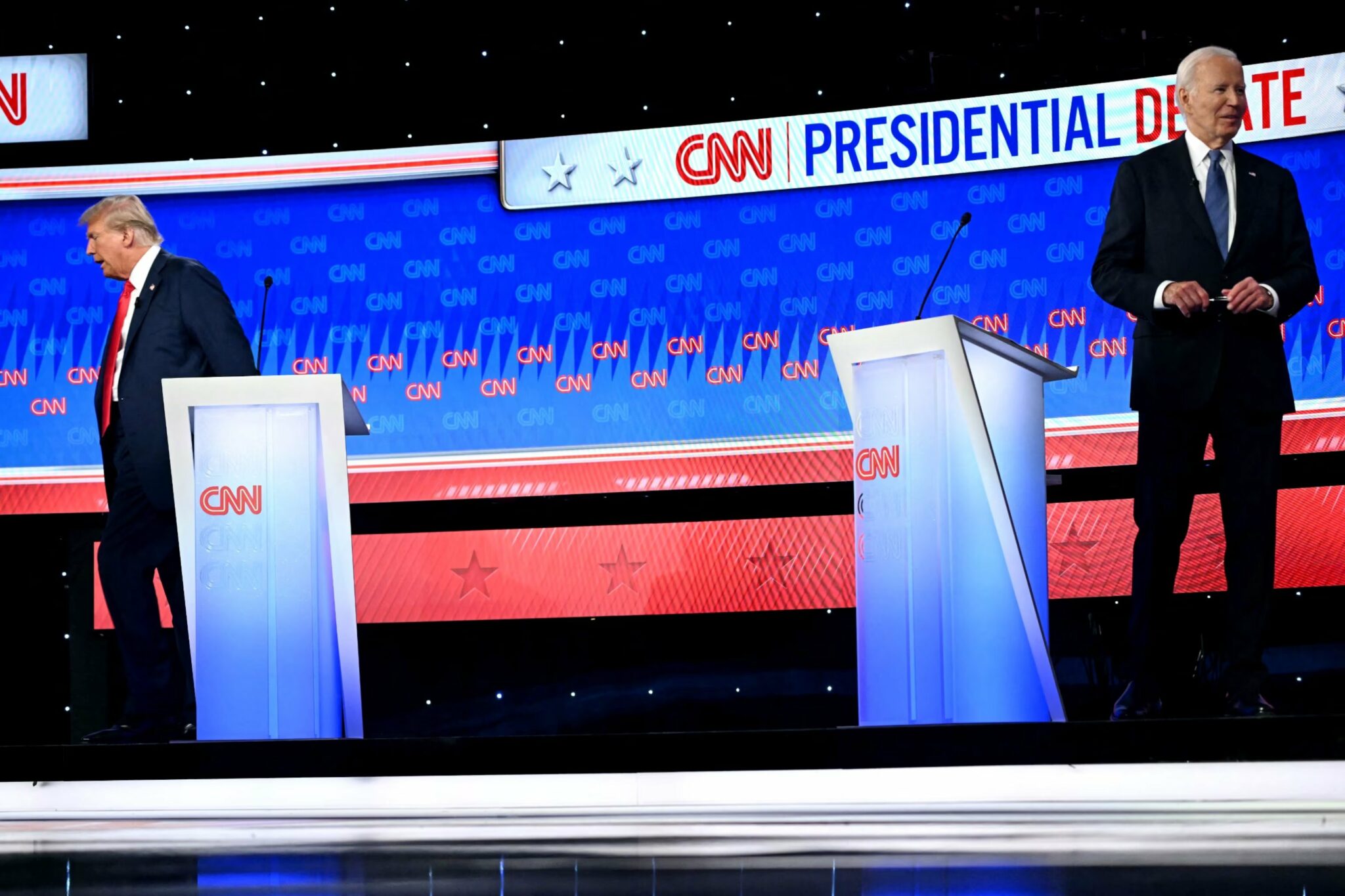 Ndërsa Donald Trump shihet që largohet menjëherë pa takuar gazetarët e CNN, ndaj të cilëve e ka të shpallur antipatinë, Joe Biden, shihet në vështirësi të gjejë shkallët.