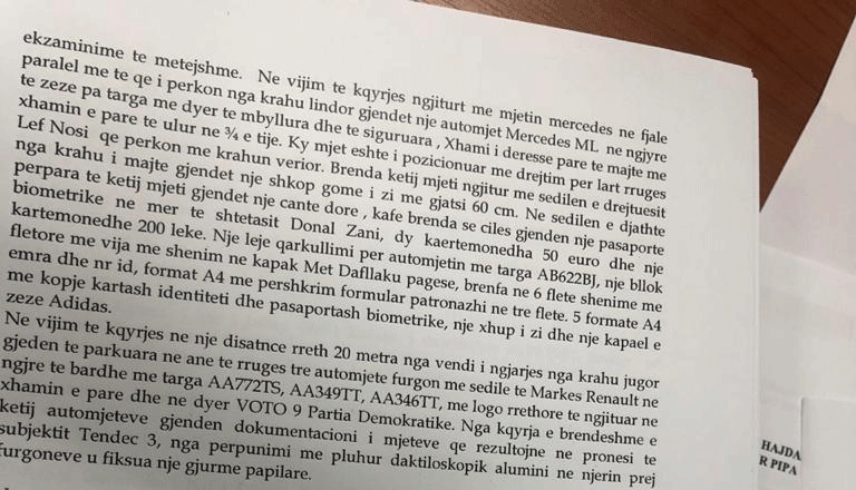 Por ndryshe nga deklarata, dokumenti i referimit të veprës penale nga Policia për Prokurorinë e Elbasanit shkruante: “Në sedilen e djathtë përpara të këtij mjeti gjendet një çantë dore kafe, brenda së cilës gjenden […] një fletore me vija me shënim në kapak Met Dafllaku pagesë, brenda në 6 fletë shënime me emra dhe nr. id, format A4 me përshkrim formular patronazhi me tre fletë, 5 formate A4 me kopje kartash identiteti dhe pasaportash biometrike…”