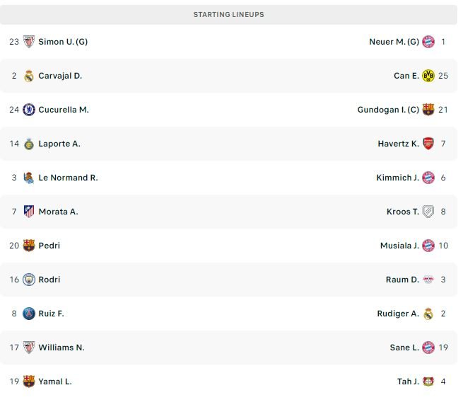 Spanja vjen në këtë takim pas fitores me shifrat e thella 4-1 kundër Gjeorgjisë. “Furia e Kuqe” kuotohet si favoritja kryesore për të fituar trofeun, dhe një gjë të tillë duhet ta vërtetojnë sot, ku kanë përballe vendasit gjerman. Spanjollët janë totalisht të karikuar për këtë përballje, dhe pritet një lojë sulmuese nga ana e tyre.
