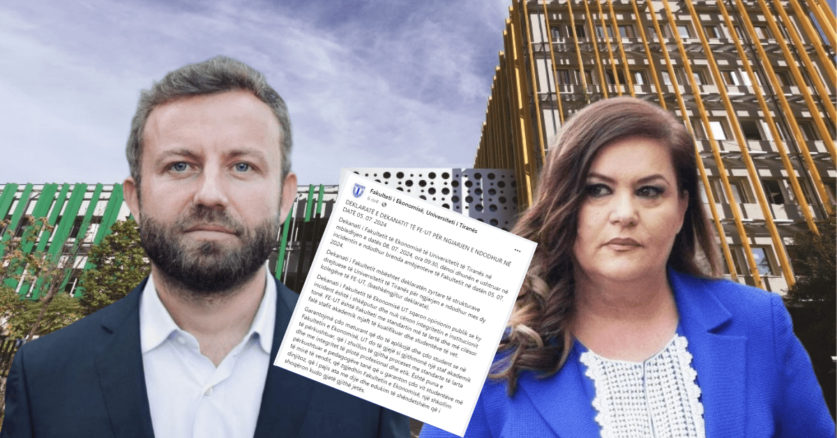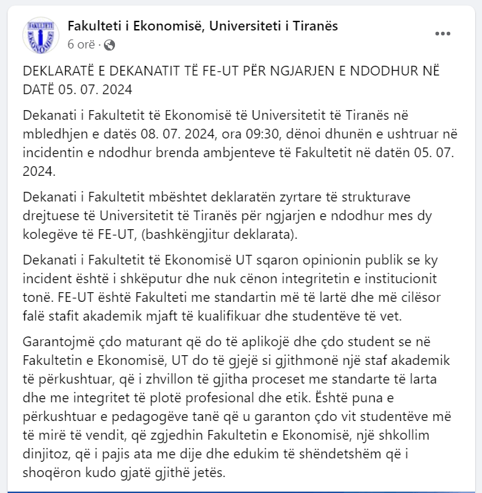 “Dekanati i Fakultetit të Ekonomisë të Universitetit të Tiranës në mbledhjen e datës 08. 07. 2024, ora 09:30, dënoi dhunën e ushtruar në incidentin e ndodhur brenda ambjenteve të Fakultetit në datën 05. 07. 2024.