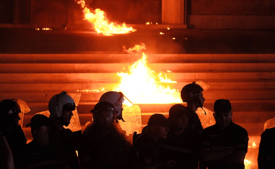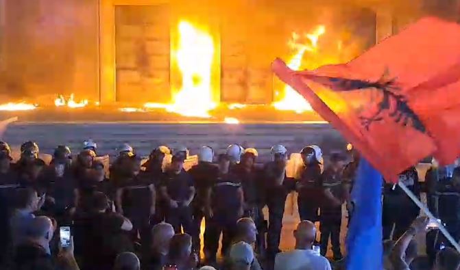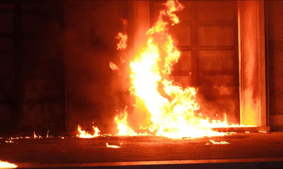 Në momentin e fjalimit të Berishës u hodhën molotv në drejtim të derës së Kryeministrisë e cila mori flakë.