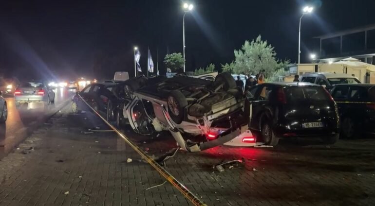 Dy automjete janë përplasur me njëra-tjetrën, dhe njëra prej tyre ka përfunduar e përmbysur në parkingun e një lokali aty pranë, duke shkaktuar dëme në 8 mjete të tjera të parkuara.