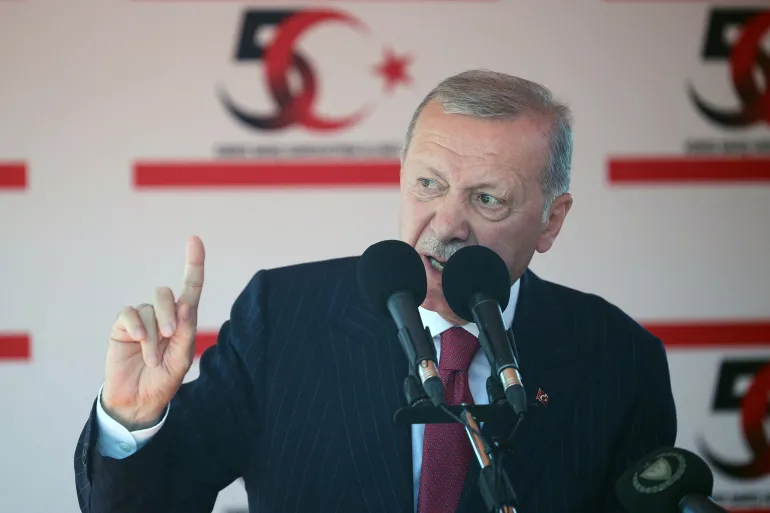 Erdogan tha se u kthye në Turqi pasi vizitoi Qipron Veriore të shtunën për të shënuar 50 vjetorin e pushtimit të Turqisë. Ai akuzoi gjithashtu Greqinë rivale se dëshiron të krijojë një bazë detare të sajën në Qipro, në të ardhmen e së cilës të dyja palët mbeten të ndara si kurrë më parë.