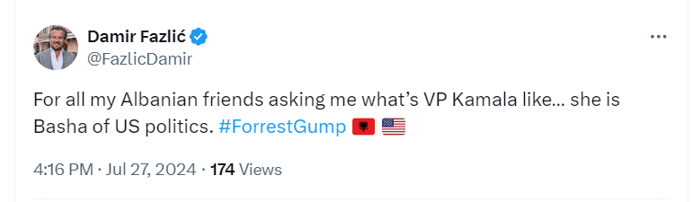 “Për të gjithë miqtë e mi shqiptarë që më pyesin se si është VP Kamala… ajo është Basha e politikës amerikane. #ForrestGump.” – shkruan Fazliç në X.
