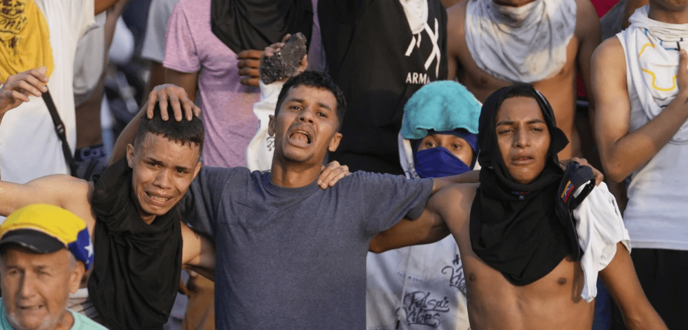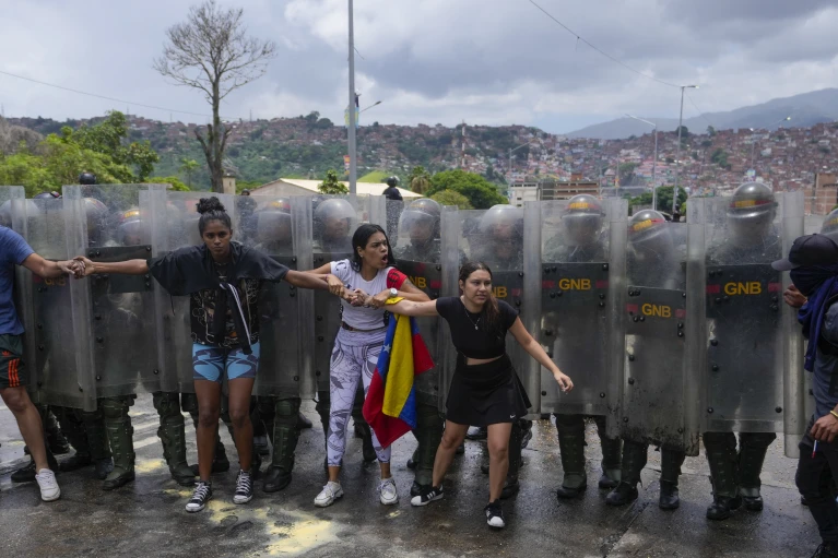 Protestuesit përqafohen ndërsa këndojnë himnin kombëtar të Venezuelës gjatë demonstratave kundër rezultateve zyrtare të zgjedhjeve