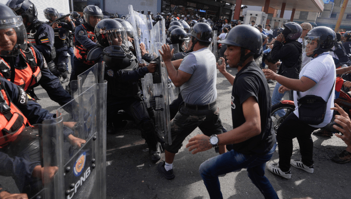 Në kryeqytetin e Venezuelës, protestat fillimisht ishin paqësore, por shpërthyen në përleshje kur oficerët e policisë kombëtare bllokuan karvanin e protestuesve. Policia përdori gaz lotsjellës për të shpërndarë protestuesit, disa nga të cilët hodhën gurë dhe sende të tjera ndaj oficerëve që ishin vendosur në një rrugë kryesore. Një burrë ka qëlluar me armë ndërkohë që protestuesit lëviznin nëpër rrethin financiar të qytetit, por nuk janë raportuar të lënduar nga armët.