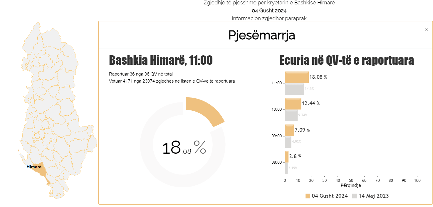 Komisioni Qendror i Zgjedhjeve raporton pjesëmarrjen e votuesve në Bashkinë Himarë duke publikuar të dhëna të përditësuara çdo 1 orë.