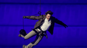 Në një shfaqje të spektaklit hollivudian, aktori Tom Cruise zbriti nga maja e stadiumit francez nën tingujt e linjës muzikore të filmit “Mission Impossible” (Misioni i Pamundur), duke shtrënguar duart me atletët, përpara se ta merrte flamurin olimpik nga atleti Simone Biles, duke e vendosur atë në pjesën e pasme të motoçikletës dhe duke u larguar nga stadiumi.