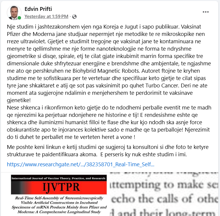 “Nje studim i jashtezakonshem vjen nga Koreja e Jugut i sapo publikuar. Vaksinat Pfizer dhe Moderna jane studjuar nepermjet nje metodike te re mikroskopike nen rreze ultraviolet. Gjetjet e studimit tregojne qe vaksinat jane te kontaminuara ne menyre te qellimshme me nje forme nanoteknologjie ne forma te ndryshme gjeometrike si disqe, spirale, etj te cilat gjate inkubimit marrin forma specifike tre dimensionale duke shfrytezuar energjine e brendshme dhe ambjentale, te ngjashme me ato qe pershkruhen ne Biohybrid Magnetic Robots. Autoret ftojne te kryhen studime me te sofistikuara per te vertetuar dhe specifiluar keto gjetje te cilat sipas tyre jane shkaktaret e atij qe sot pas vaksinimit po quhet Turbo Cancer. Deri ne ate moment ata sugjerojne ndalimin e menjehershem te perdorimit te vaksinave gjenetike! Nese shkenca i rikonfirmon keto gjetje do te ndodhemi perballe eventit me te madh qe njerezimi ka perjetuar ndonjehere ne historine e tij! E rendesishme eshte qe shkenca dhe iluminizmi humanist filloi te flase dhe kur kjo ndodh ska asnje force obskurantiste apo te injorances kolektive sado e madhe qe ta perballoje! Njerezimit do ti duhet te perballet me te verteten heret a vone ! Me poshte keni linkun e ketij studimi qe sugjeroj ta konsultoni si dhe foto te ketyre strukturave te paidentifikuara akoma. E perseris ky nuk eshte studim i imi.” – shkruan Prifti.