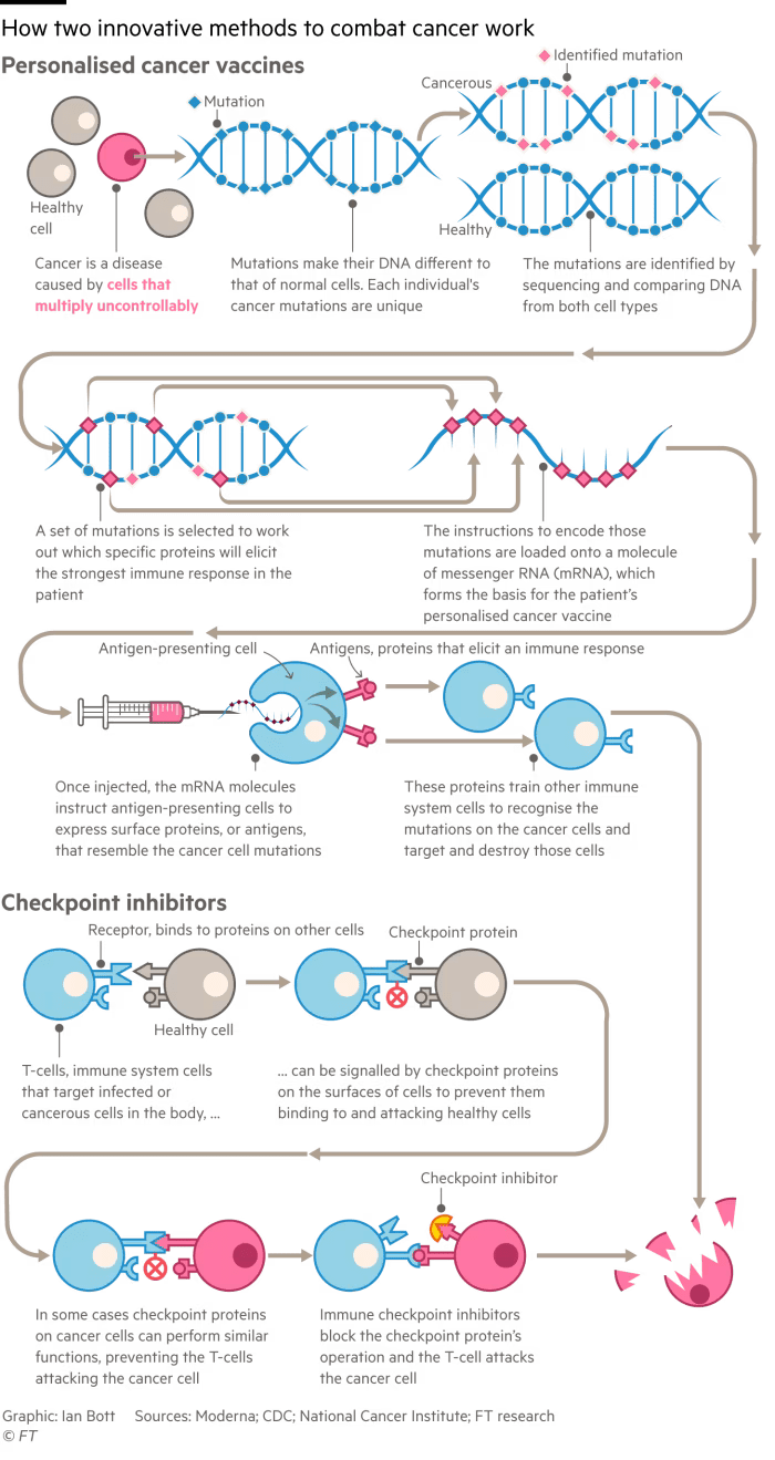 BioNTech dhe rivali amerikan për vaksinën kundër koronavirusit Moderna, aksionet e të cilave kanë rënë me rreth 80 përqind që nga kulmi i tyre i pandemisë në vitin 2021, kanë vënë bast me vaksinat e kancerit për të ringjallur pasurinë. Duke përdorur teknologjinë mRNA pas produkteve të tyre Covid, ata shpresojnë të përmirësojnë në mënyrë drastike rezultatet dhe të udhëheqin një fushë të re të kujdesit ndaj kancerit.