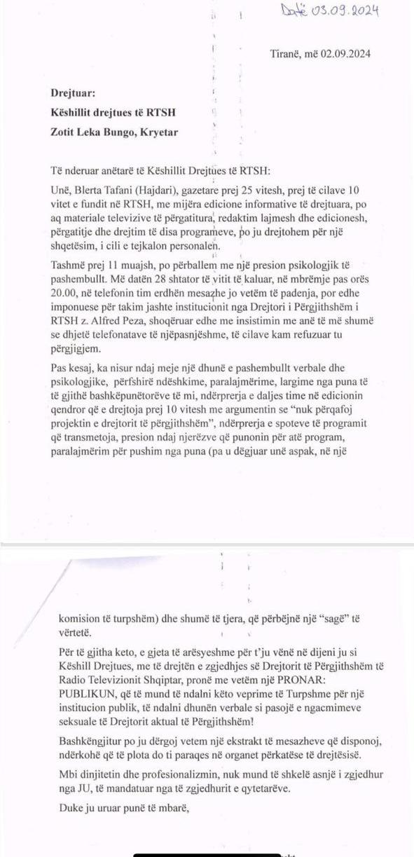 “Tashmë prej 11 muajsh, po përballem me një presion psikologjik të pashembullt. Më datën 28 shtator të vitit të kaluar, në mbrëmje pas orës 20.00, në telefonin tim erdhën mesazhe jo vetëm të padenja, por edhe imponuese për takim jashte institucionit nga Drejtori i Përgjithshëm i RTSH z. Alfred Peza, shoqëruar edhe me insistimin me anë të më shumë se dhjetë telefonatave të njëpasnjëshme, të cilave kam refuzuar tu përgjigjem.