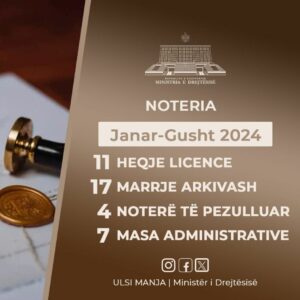 “Gjatë periudhës Janar-Gusht 2024, Ministria e Drejtësisë ka forcuar dhe intensifikuar kontrollet në zyrat noteriale në të gjithë vendin, duke realizuar 42 inspektime, një rritje e ndjeshme krahasuar me vitin e kaluar.