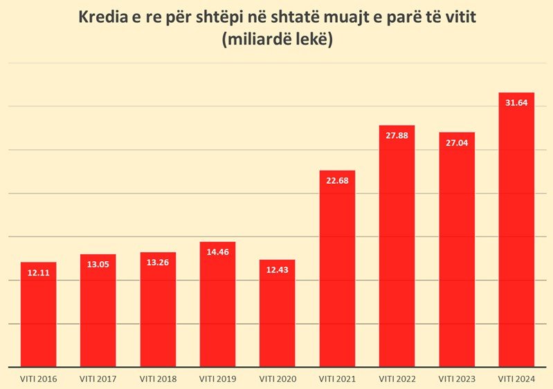 Për shtatë muajt e parë të vitit, kredia e re për shtëpi arriti rekordin historik prej 31.6 miliardë lekësh, në rritje me 17% krahasuar me të njëjtën periudhë të një viti më parë.