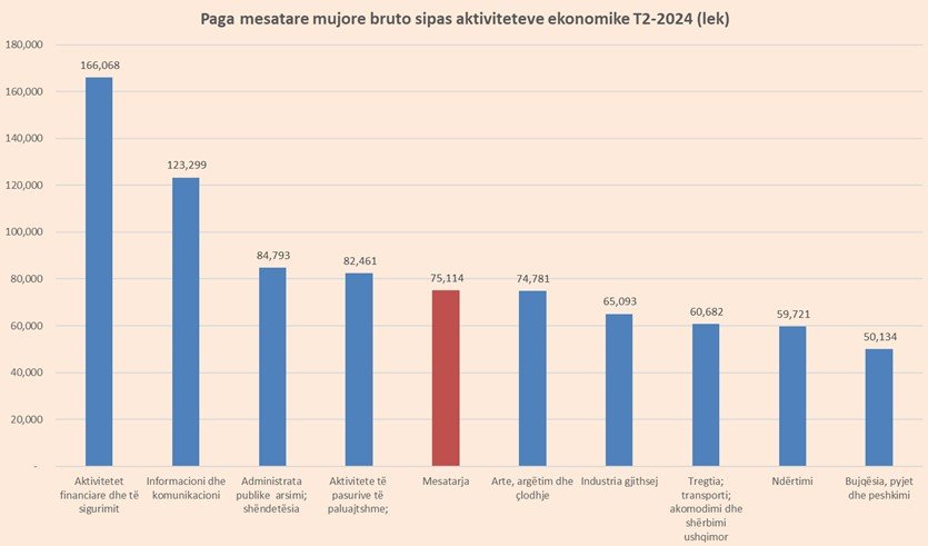 Në anën tjetër pagat në aktivitet financiare, informacionit dhe komunikimit, administratës publike dhe aktiviteteve të pasurive të paluajtshme kishin paga mbi nivelin e pagës mesatare në tremujorin e dytë të vitit 2024.