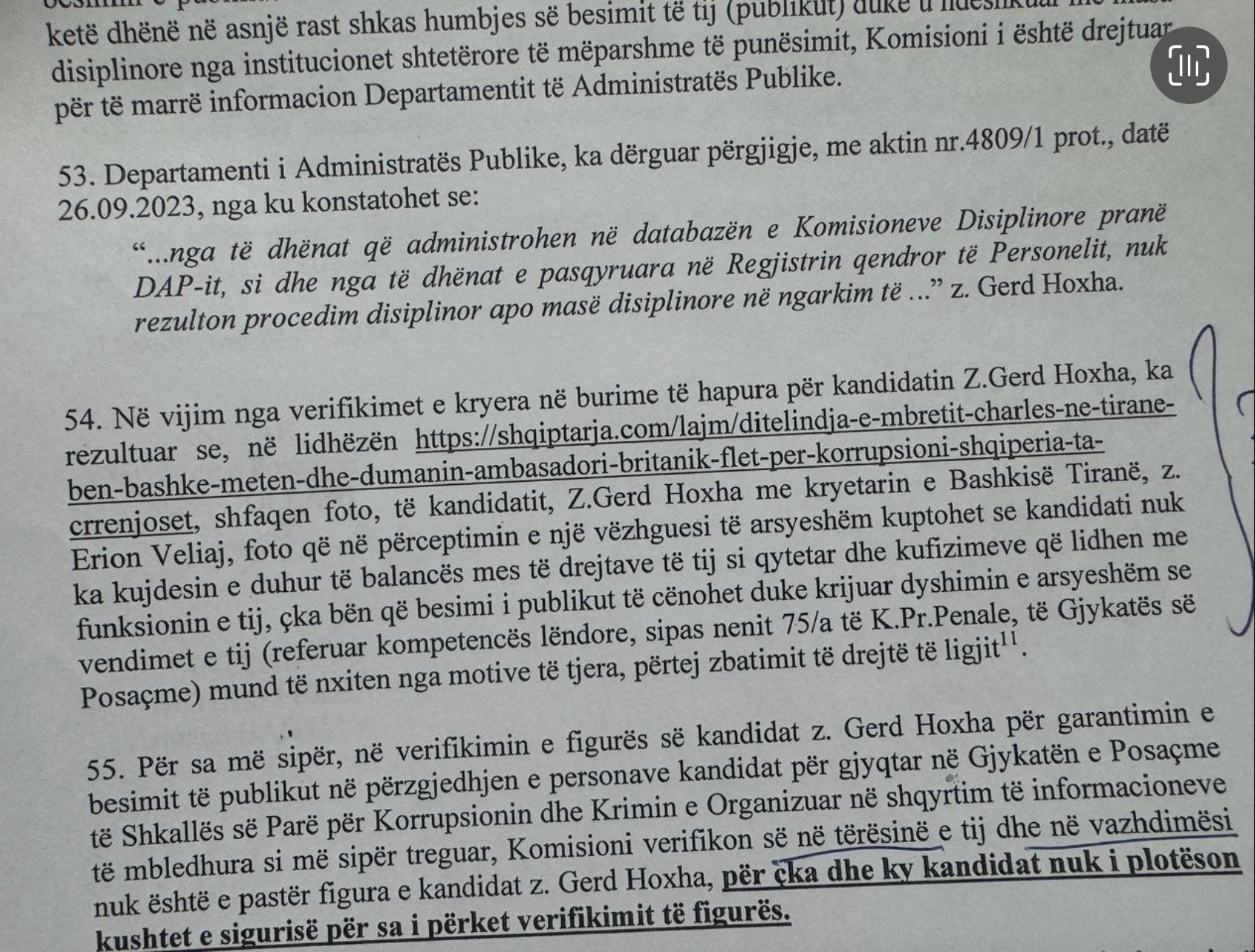 Pra ndonëse Gerd Hoxha është verifikuar në figurën e tij nga një organ madhor i vettingut, për komisionin e posaçëm të SPAK-ut mjafton një pretekst, një foto nga media në një festë me qindra të ftuar, ku shfaqet në një fraksion sekondi Gerd Hoxha duke takuar Veliajn, por kaq i mjafton këtij komisionin që ta quajë lidhje të papërshtatshme.