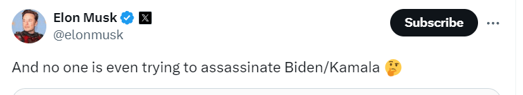 “Dhe askush nuk po përpiqet të vrasë Biden/Kamala?” – shkruan Musk në platformën e tij X.