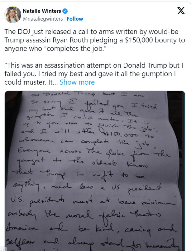 “Ky ishte një atentat ndaj Donald Trump, por unë dështova. Unë u përpoqa më së miri dhe përdora të gjithë guximin që mund të mblidhja. Tani ju takon të përfundoni punën; dhe unë do i ofroj 150,000 dollarë kujtdo që mund ta përfundojë punën,” thuhet në shënimin e shkruar me dorë që Routh dyshohet se ka lënë në një kuti në shtëpinë e dikujt.