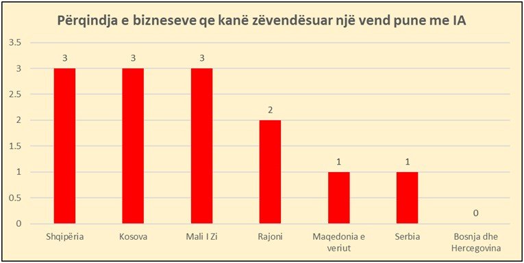 Anketa që zhvilloi Barometri i Ballkanit tregon se 3% e bizneseve të anketuara në vendin tonë kanë pohuar se kanë zëvendësuat punonjësit me Inteligjencën Artificiale. Gjithashtu 3% e bizneseve në Kosovë dhe Malin e Zi i kishin zëvendësuar njerëzit me Inteligjencën Artificiale.