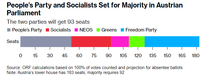 Partia Popullore dhe Socialistët pritet të kenë 93 vende së bashku, sipas rezultateve paraprake – mjaftueshëm për një shumicë – por ata ende mund të përfshijnë një parti të tretë në koalicionin e tyre, me shumë gjasa NEOS-in liberal.