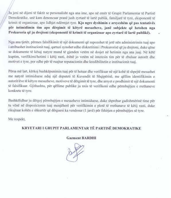 “Këto mesazhe intimiduese dhe me përmbajtje tërësisht të rreme vijnë pas seancës plenare të datës 12 Shtator 2024, ku gjatë një interpelance me Kryeministrin e Shqipërisë Edi Rama, unë në cilësinë e deputetit të Kuvendit të Shqipërisë e përballa atë me disa të dhëna të platformës SKY/EÇ që janë bërë publike, si dhe e paralajmërova se shumë shpejt do ta përballë me të dhëna të tjera të të njëjtës natyrë që provojnë lidhjet mes funksionarëve të lartë publik dhe krimit të organizuar, gjithmonë pa cenuar dhe duke respektuar rregullat për ruajtjen e sekretit hetimor. Gjithashtu, për qëllime publike ju nxis të verifikoni edhe përmbajtjen e rrethaneve konkrete të tyre.” – thuhet në letrën e Bardhit drejtuar kreut të SPAK-ut, Dumani.