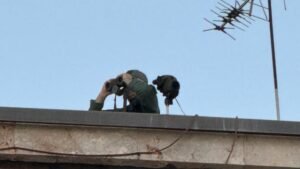 Mbi godinën e kryeministrisë janë pozicionuar disa punonjës, të cilët monitorojnë me dylbi protestuesit.