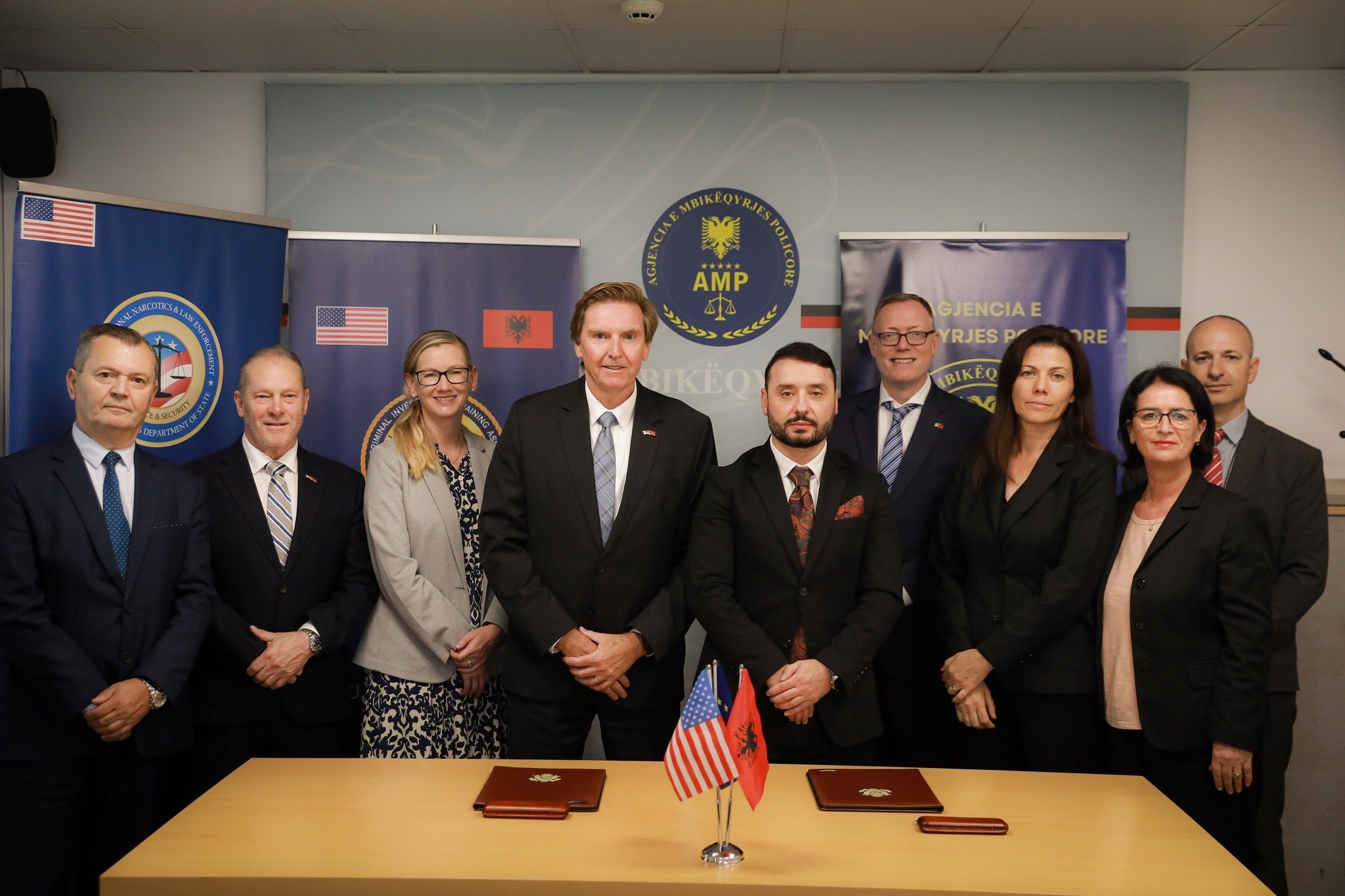 Përfaqësues të Ambasadës së SHBA nga Byroja e Departamentit të Shtetit për Çështjet Ndërkombëtare të Narkotikëve dhe Zbatimit të Ligjit (INL) dhe Programi Ndërkombëtar i Departamentit të Drejtësisë i Ndihmës për Trajnimin për Hetimet Penale (ICITAP) iu bashkuan Drejtorit të Përgjithshëm të Agjencisë së Mbikëqyrjes Policore (POA) Florian Sulejmani për dhurimin dhe dorëzimin si ndihmë teknike të një Sistemi të Menaxhimit të Çështjeve (CMS) tek AMP.