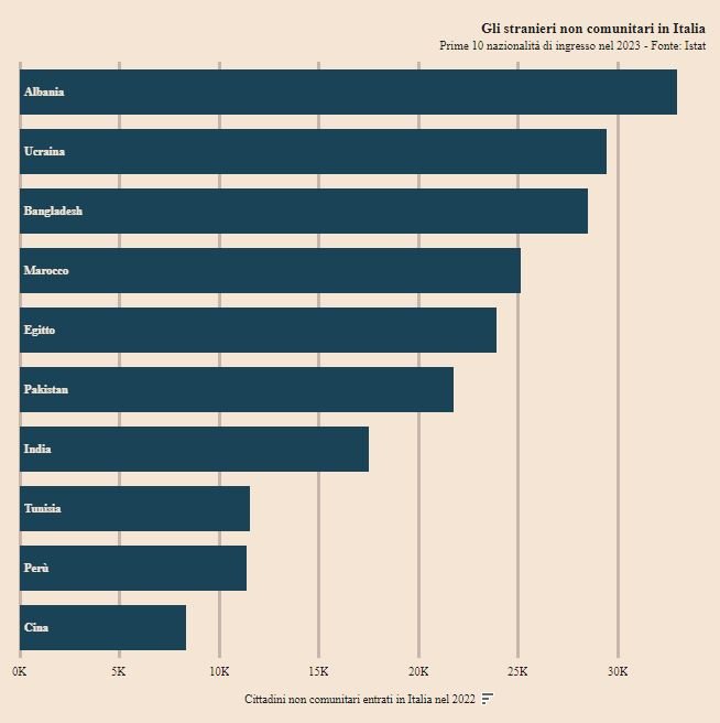 Grafiku, i cili tregon 10 kombësitë më të shumta për leje të dhëna në 2023, tregon arsyet që i kanë shtyrë njerëzit drejt Italisë.