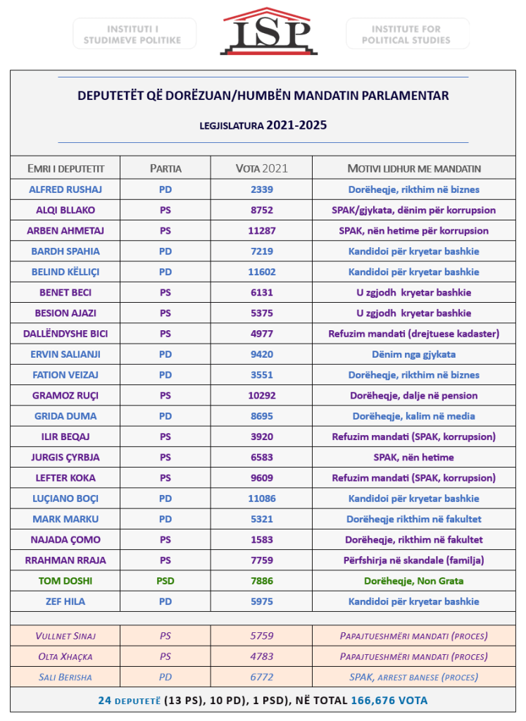 “Në mandatin e tretë të PS në qeverisje dhe në legjislaturën e 10-të të tranzicionit, kemi 21 deputetë që kanë ndërprerë kontratën e besimit me qytetarët votues (2021) dhe 3 të tjerë që mund ta humbasin mandatin në muajt e ardhshëm. Në total, rreth 160 mijë vota ose rreth 10% e votave të dhëna më 2021 nuk përfaqëson më në parlament. Disa dhanë dorëheqje menjëherë pas zgjedhjes (informacione paraprake për hetim nga SPAK, për qenie në listën e zezë amerikane apo arsye të tjera të komoditetit personal), disa dhanë dorëheqje gjatë mandatit duke iu rikthyer bizneseve më fitimprurëse, disa u detyruan të japin dorëheqje pas skandaleve personale apo familjare dhe disa u detyruan për shkak të hetimeve nga SPAK apo dënimeve nga sistemi i drejtësisë”, thuhet në raportin e ISP-së.