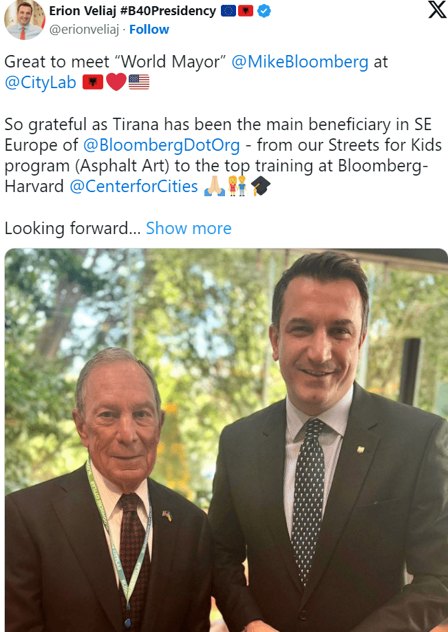 “Kënaqësi të takoja “Kryebashkiakun e Botës”, Mike Bloomberg, në Bloomberg CityLab. Jam shumë mirënjohës që Tirana ka qenë ndër përfituesit kryesor në Europën Juglindore nga Bloomberg Philanthropies – nga programi “Rrugët për Fëmijët” (Asphalt Art), deri te trajnimet në Qendrën Bloomberg për Qytetet në Universitetin e Harvardit. Mezi pres projektet tona të reja për të rinjtë, klimën dhe inovacionin në qytet”, shkruan Veliaj.