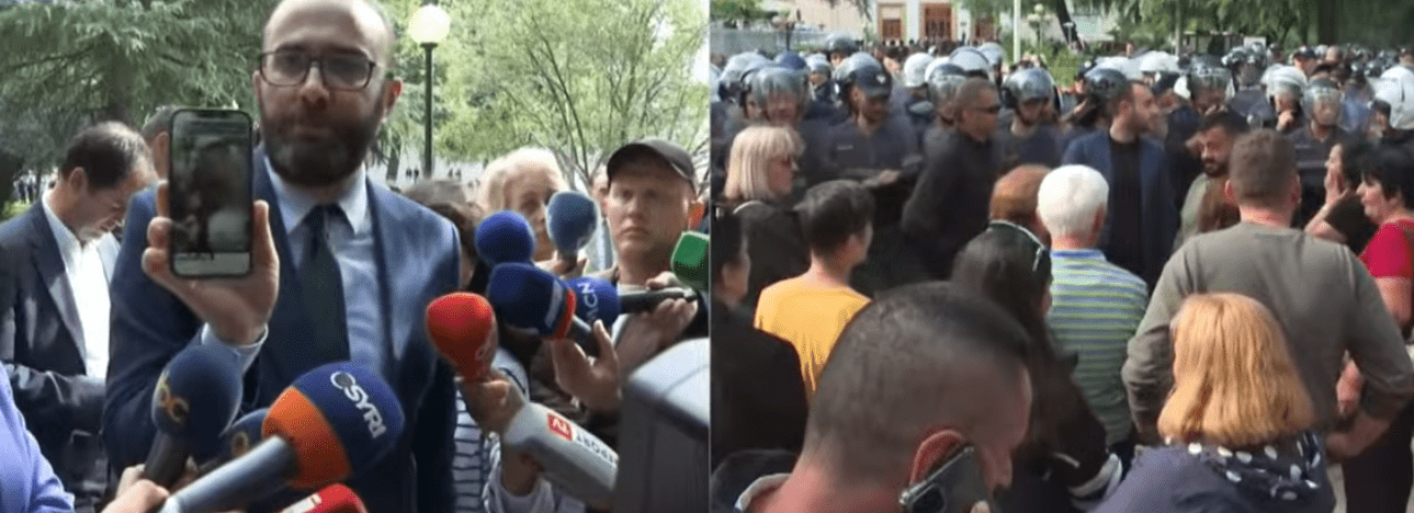 Ai e bëri denoncimin në oborrin e Kuvendit ku deputetët e PD-së dhe mbështetës të saj janë mbledhur dhe po përpiqen të hyjnë brenda.