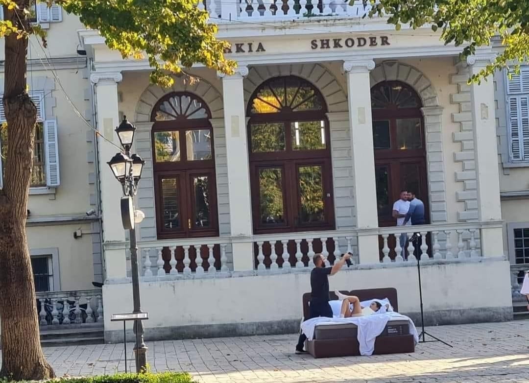 Një krevat dopio mbi të cilin qëndronin një çift të rinjsh është vendosur para godinës, poshtë ballkonit të kryebashkiakut të PS-së Benet Beci.