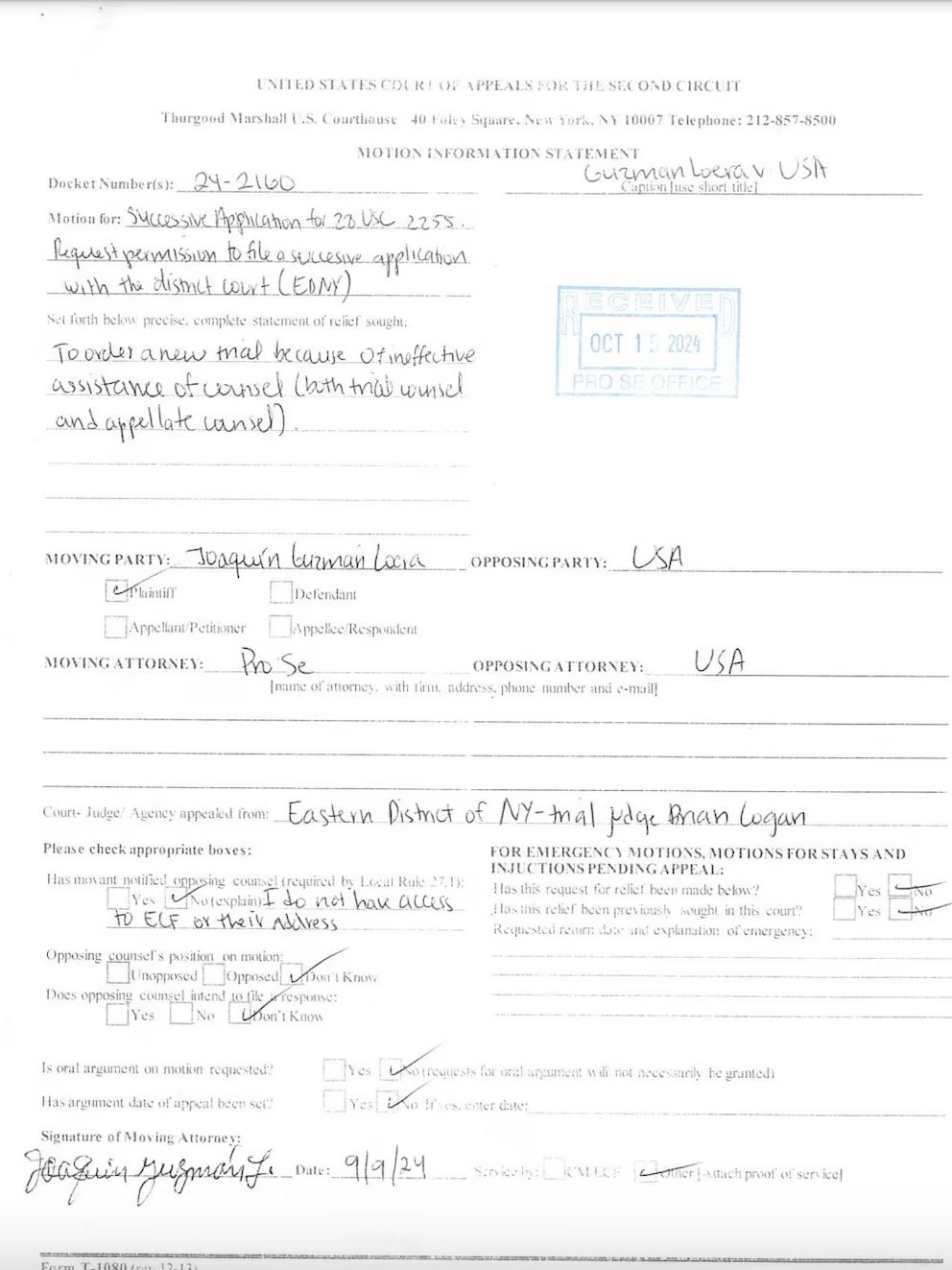 Në letrën e tij më të fundit, Guzmán akuzon ish-skuadrën e tij të mbrojtjes, të udhëhequr nga Jeffrey Lichtman, për përfaqësim joefektiv. Ai tani kërkon një gjyq të ri mbi këto arsye, megjithëse ekspertët ligjorë sugjerojnë se mundësitë e tij për sukses janë të pakta.