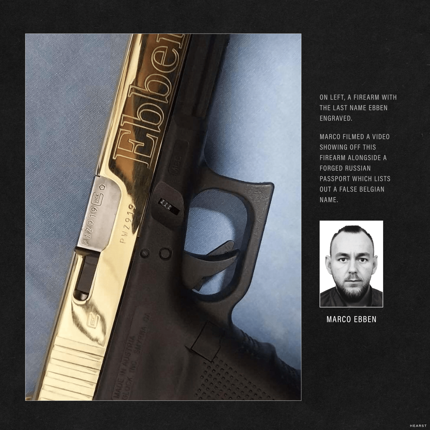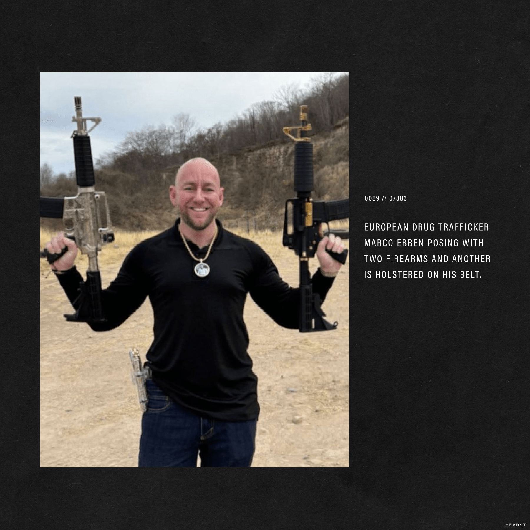 “Unë dyshoj se dikush tjetër e ka këtë.” Kamera u zhvendos në një grup automatikësh M4 dhe AK47. Në njërën janë inicialet ME, tjetra, ngjyrë ari me flamurin holandez, ka të gdhendur emrin e tij të plotë.