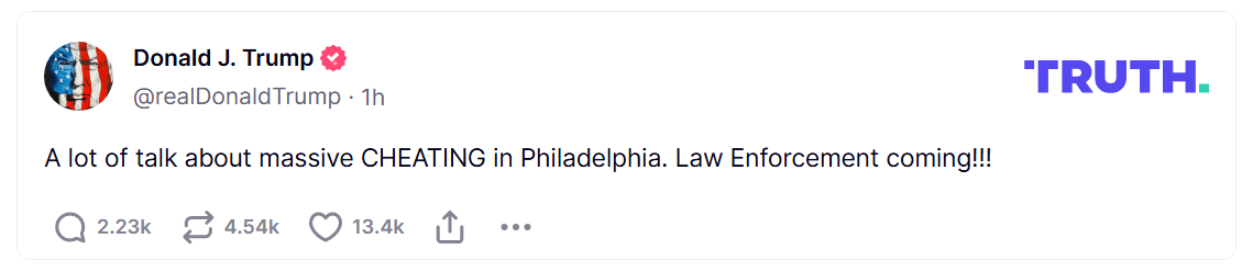 “Po flitet shumë për mashtrimin masiv në Filadelfia. Forcat e ligjit po vijnë!” ka shkruar Trump, duke mos dhënë më shumë informacion.