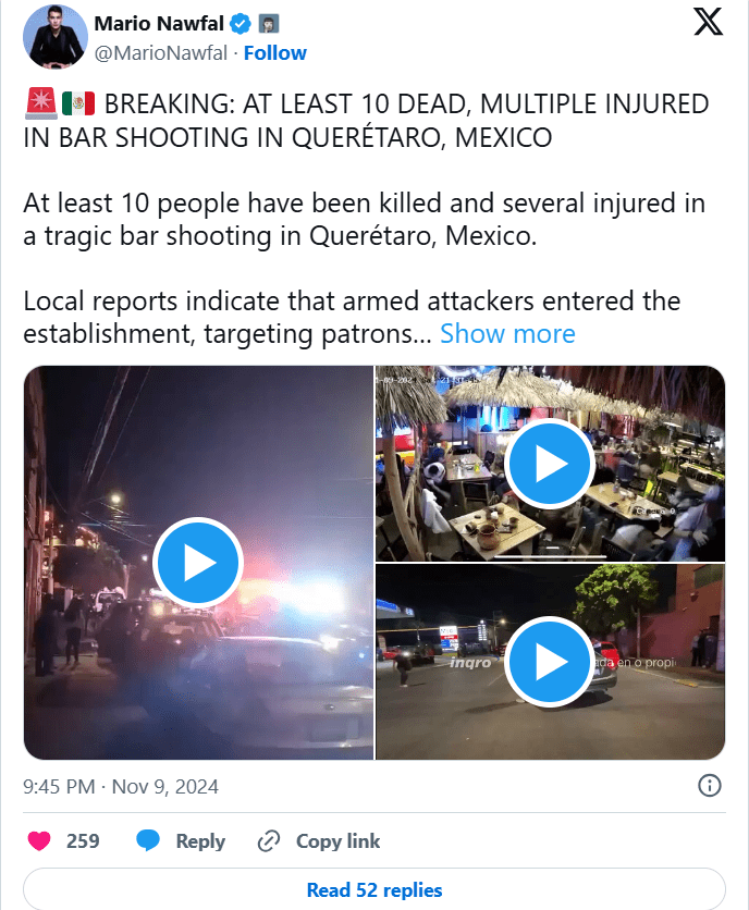 “Për momentin, ne e dimë se dhjetë persona kanë humbur jetën dhe shtatë janë lënduar (si pasojë e të shtënave)”, tha kreu i shërbimit komunal të sigurisë publike të Queretaros.