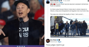 Elon Musk ka mbështetur kryeministren italiane Giorgia Meloni pas vendimit të gjyqtarëve të seksionit të emigracionit në Romë, të cilët anuluan transferimin e emigrantëve në Shqipëri. Musk ka reaguar në rrjetin social X, duke thënë se “këta gjyqtarë duhet të ikin”, duke kritikuar vendimin e Gjykatës së Romës që e çoi çështjen në Gjykatën Evropiane të Drejtësisë.