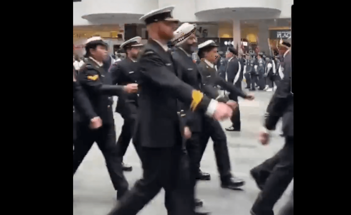 Ushtarët shihen duke marshuar të paorganizuar si ushtri e çrrregullt.