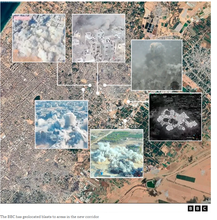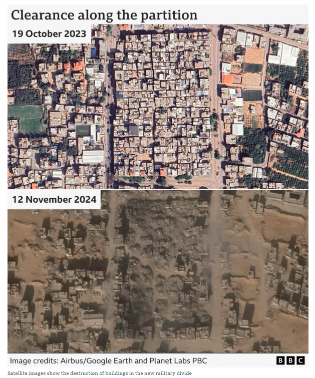 BBC ka dokumentuar më parë se si janë ndërtuar dy ndarje në Gaza që nga fillimi i luftës aktuale. Korridori Netzarim ndan një zonë në jug të qytetit të Gazës, ndërsa Korridori i Filadelfit i jep IDF-së kontrollin e tokës që kalon në gjatësinë e kufirit të Gazës me Egjiptin.