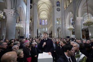 Pak ditë pasi bota ishte bërë dëshmitare e rrëzimit të kullës më të lartë të Notre Dame gjatë zjarrit të prillit 2019, Macron qe shprehur se Katedralja do të rindërtohej brenda pesë viteve. “Unë po ju them solemnisht sonte: kjo katedrale do të rindërtohet nga ne të gjithë së bashku. Dhe ndoshta është pjesë e fatit të Francës dhe do të jetë projekti ynë për vitet në vijim. Unë jam i përkushtuar për këtë”, deklaroi asokohe ai.
